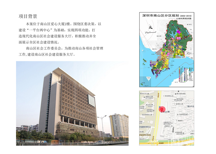 | 設(shè)計說明 | 本案位于南山區(qū)愛心大廈2樓。圍繞區(qū)委決策,以建設(shè)“一平臺兩中心”為基礎(chǔ),實現(xiàn)四項功能。打造現(xiàn)代化南山區(qū)社會建設(shè)服務(wù)大廳,積極推動并全面展示全區(qū)社會建設(shè)情況。 | ||||