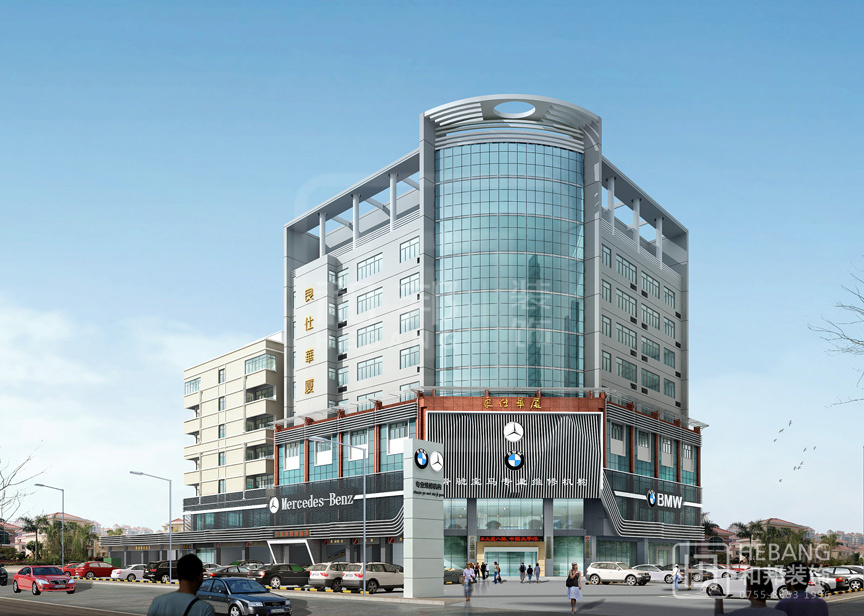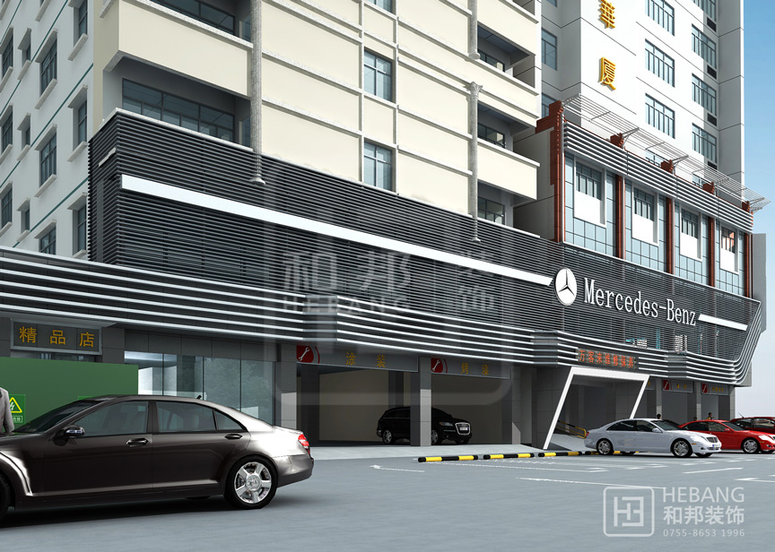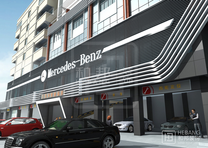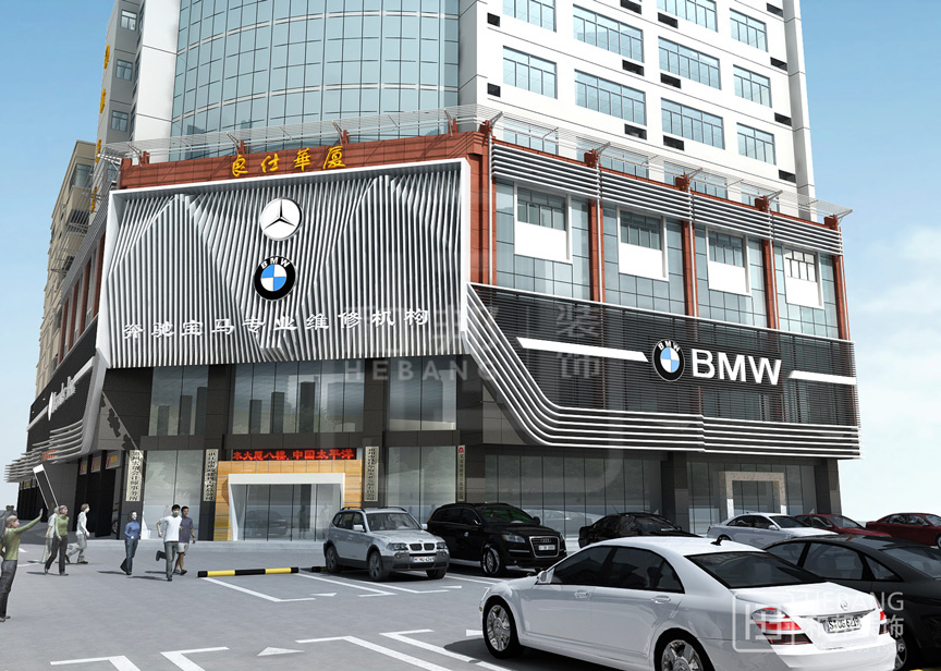 高端大氣的現(xiàn)代設計:以汽車頭部為原型設計的門頭,大膽新穎,創(chuàng)新十足。分區(qū)設計,奔馳與寶馬維修店分布兩旁,使整個維修機構美觀大方。