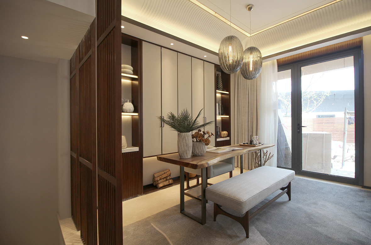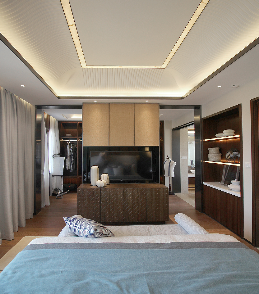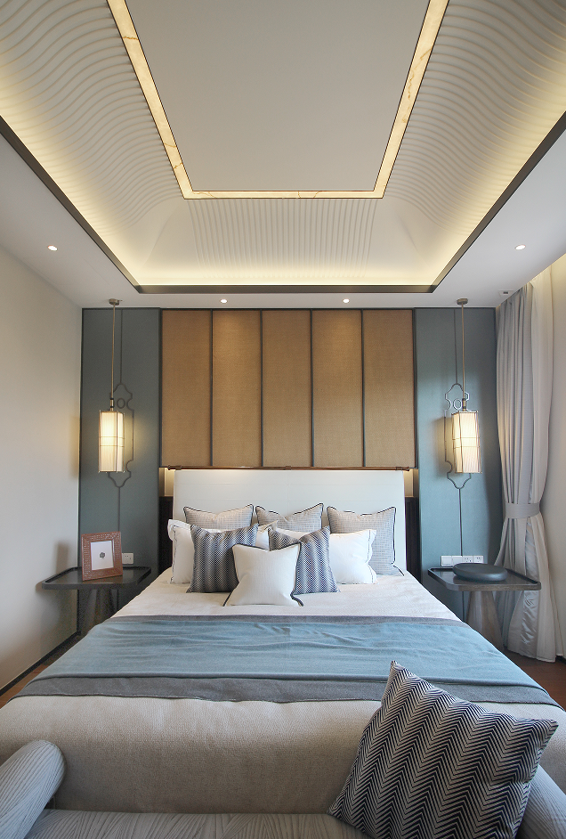 整體采用大地色家具,更加系統(tǒng)性,搭配上同樣休閑質(zhì)感的床品,通過(guò)材質(zhì)本身的層次與質(zhì)感去傳達(dá)空間的氣韻。