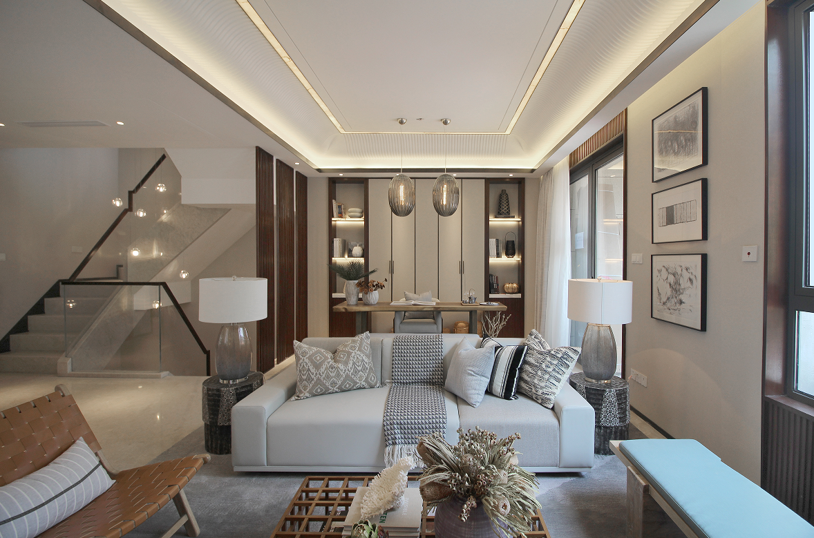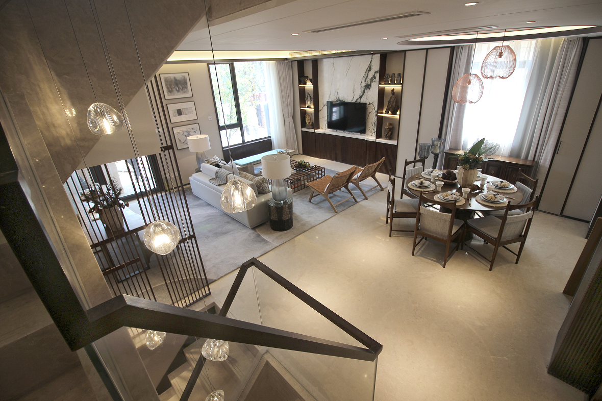 客廳作為一層空間交互的中心,連通戶外,讓光線被最大化地保留于空間之中,同時(shí)打開(kāi)視覺(jué)界面。帶有紋理的大理石以增加質(zhì)感,鋪就整面墻,與米色大理石地面形成呼應(yīng),再以木飾面和屏風(fēng)進(jìn)行過(guò)渡。