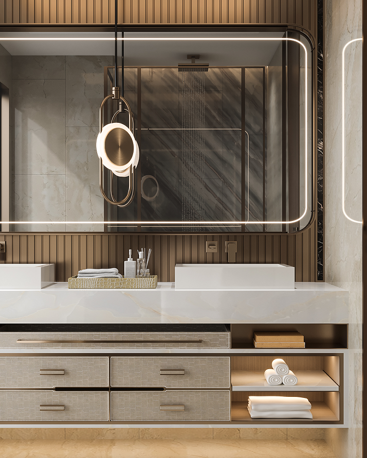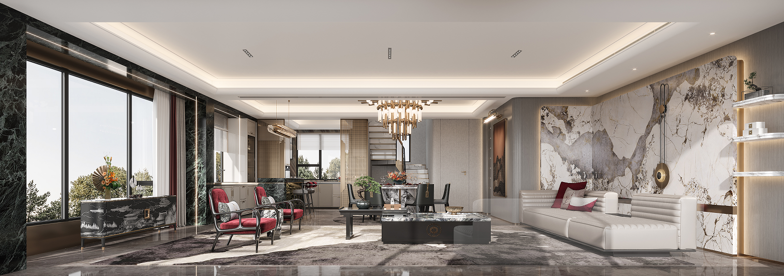 一層以“見山”為題,強(qiáng)調(diào)一種寬廣的、壯闊的詩意生活。基于建筑條件中極具優(yōu)勢的景觀資源條件,整體空間以“向外打開”的通透意境處理界面與層次關(guān)系,渾厚而瑩潤的古銅色調(diào)以匹配大開大合的空間尺度而營造出居室特有的生活氛圍。開門見山,獨(dú)享豁達(dá)人生。