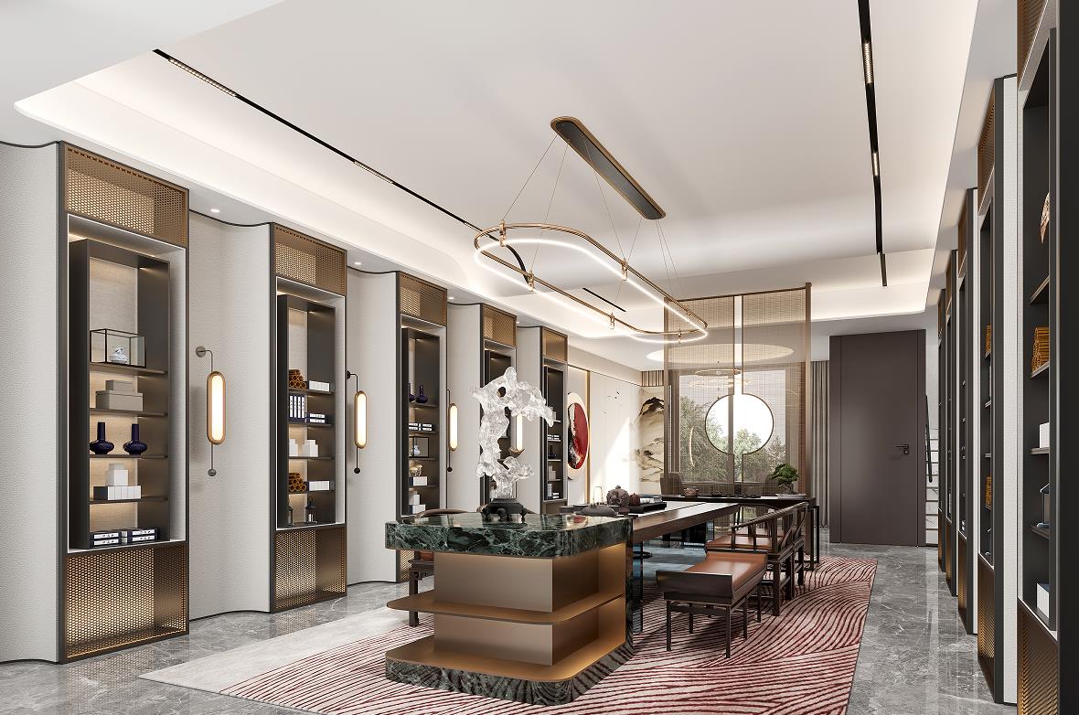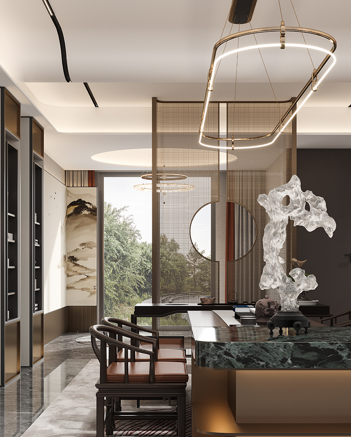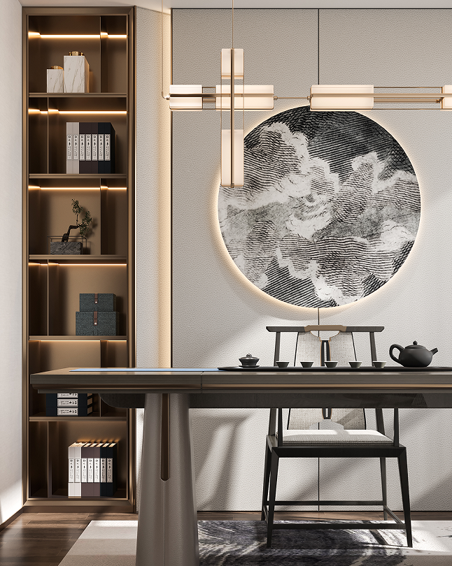負(fù)一層會客廳打造為男主人的社交空間,精致的茶臺,私享的收藏展閱,是屬于和朋友閑談、聊天的專屬場所。