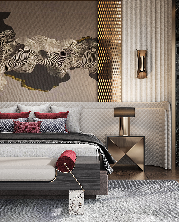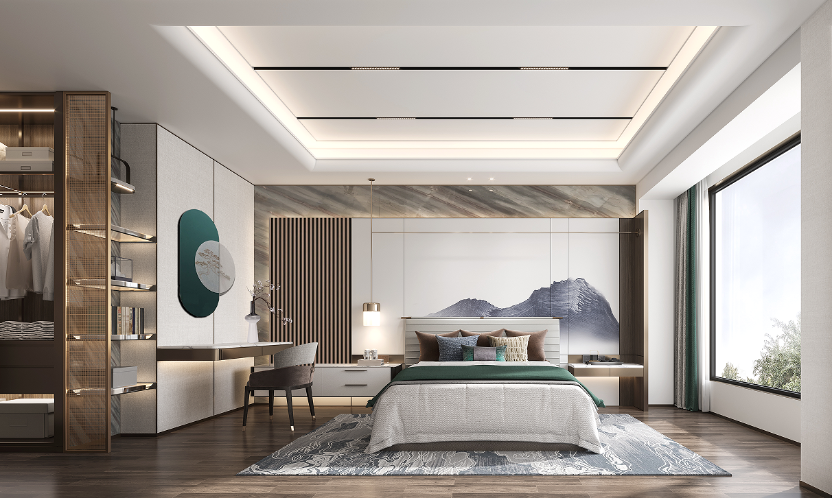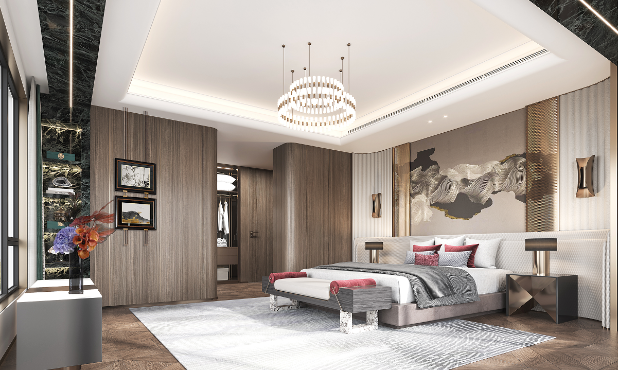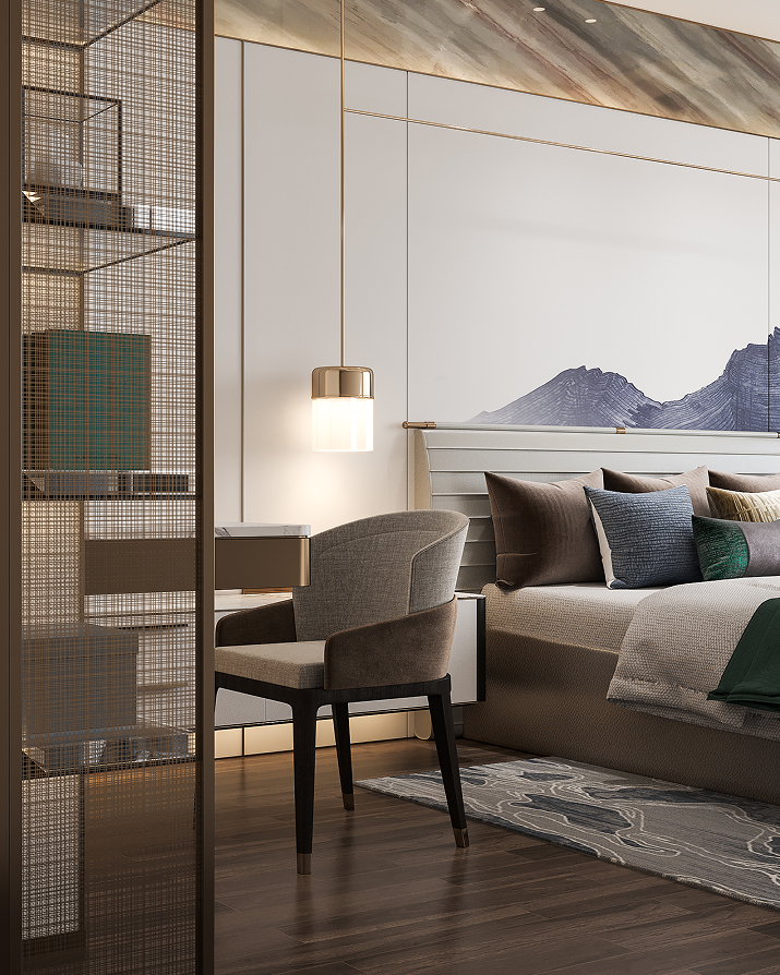 二層主臥空間環(huán)景式體驗主臥套間形式,擁有超大景觀視野,并配備了獨(dú)立衣帽間、衛(wèi)浴室。軟裝將裝飾的重點放在了色彩的呼應(yīng)關(guān)系、與面料觸感與肌理給予人的真實體驗之上,隨處可見的進(jìn)口家具產(chǎn)品將主人的品味于隨意處散發(fā),呈現(xiàn)了一處格調(diào)高雅的休憩空間。