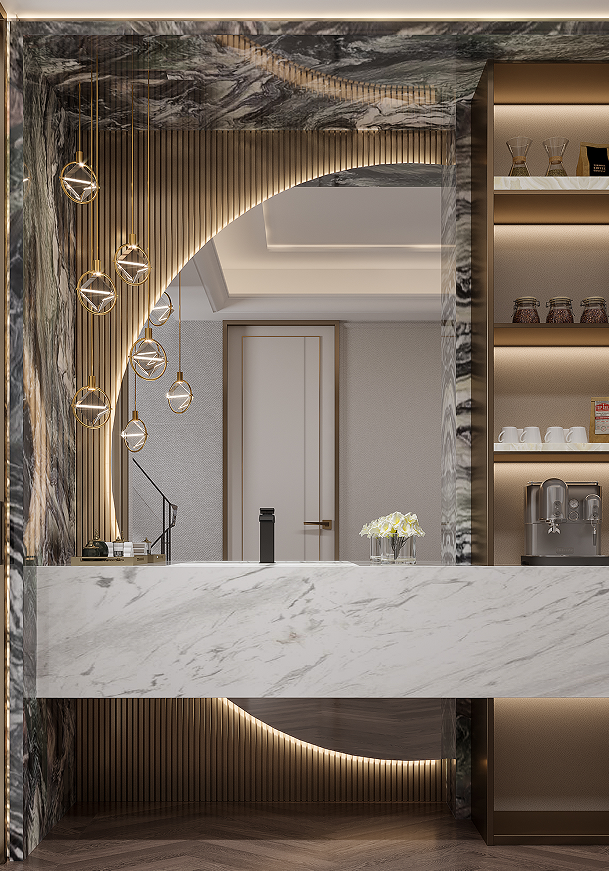 上疊一層多功能家庭活動(dòng)室滿足聚會(huì)、觀影、沙龍等多樣化生活場(chǎng)景,紋理天然的背景奢石、鏡面水紋不銹鋼,幻化成熠熠生輝的發(fā)光源在空間中閃耀,為聚會(huì)增添了更為閃亮的氛圍。